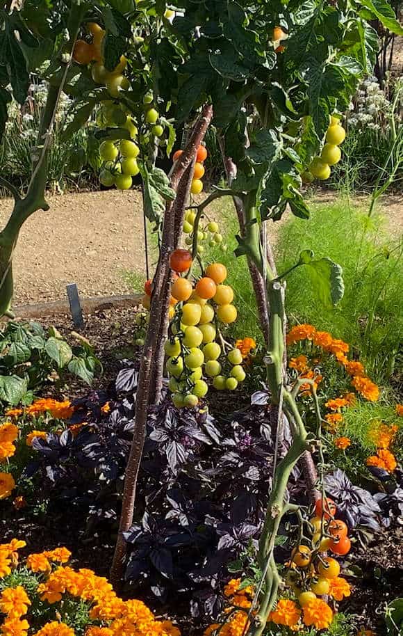 Also designed by Ann-Marie Powell, it has a broad pergola running from the café through the central section of the garden, covered with climbing vegetables such as gourds, and is edged with edible, annual and perennial flowers. To either side is outdoor seating for the café, and beds of household vegetables with trusses of different types of tomatoes.