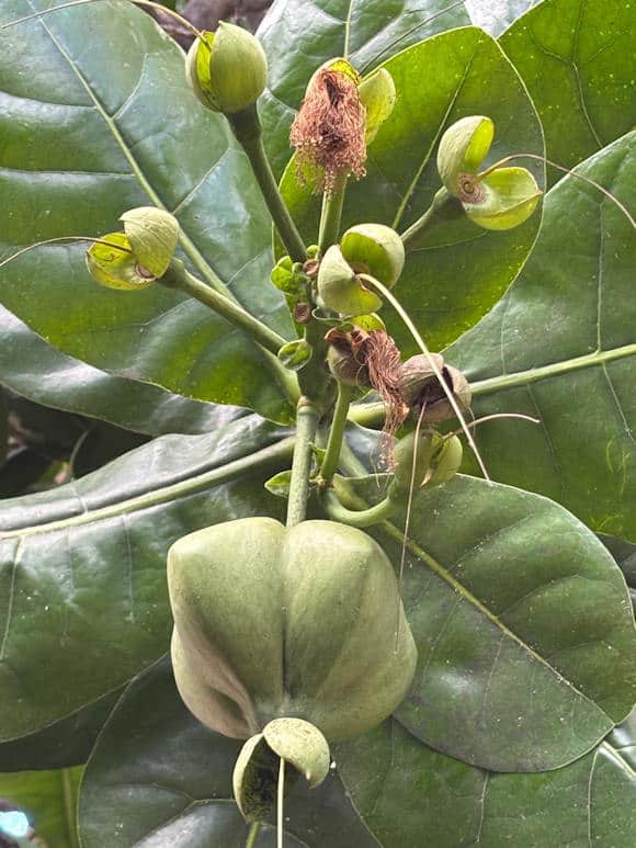 The entrance is beside a white curved spiral tower, wrapped around a lift which leads across a glass-sided bridge to gently rising inclines zig-zagging up the hillside. The summit is relatively flat with sinuous paths that take you through the various biogeographical zones, past streams, ponds and waterfalls and with views over the ocean. Companion planting of shrubs and ground cover from the appropriate areas make the settings look natural. Although there are sections dedicated to Asia and South and Central America, what makes the collection remarkable is the diversity of palms from isolated island groups, such as Hawaii, Madagascar, Borneo and New Guinea and islands of the Caribbean. Unusually, there are aquatic palms, climbing and ground-cover palms to be found, and many others threatened with extinction, some critically so. There are some small areas roped off which appear to be for further developments. Irrigation, where needed, is with recycled water from sewage.